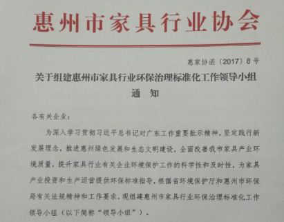 惠州市家具行業(yè)組建環(huán)保治理標(biāo)準(zhǔn)化工作領(lǐng)導(dǎo)小組