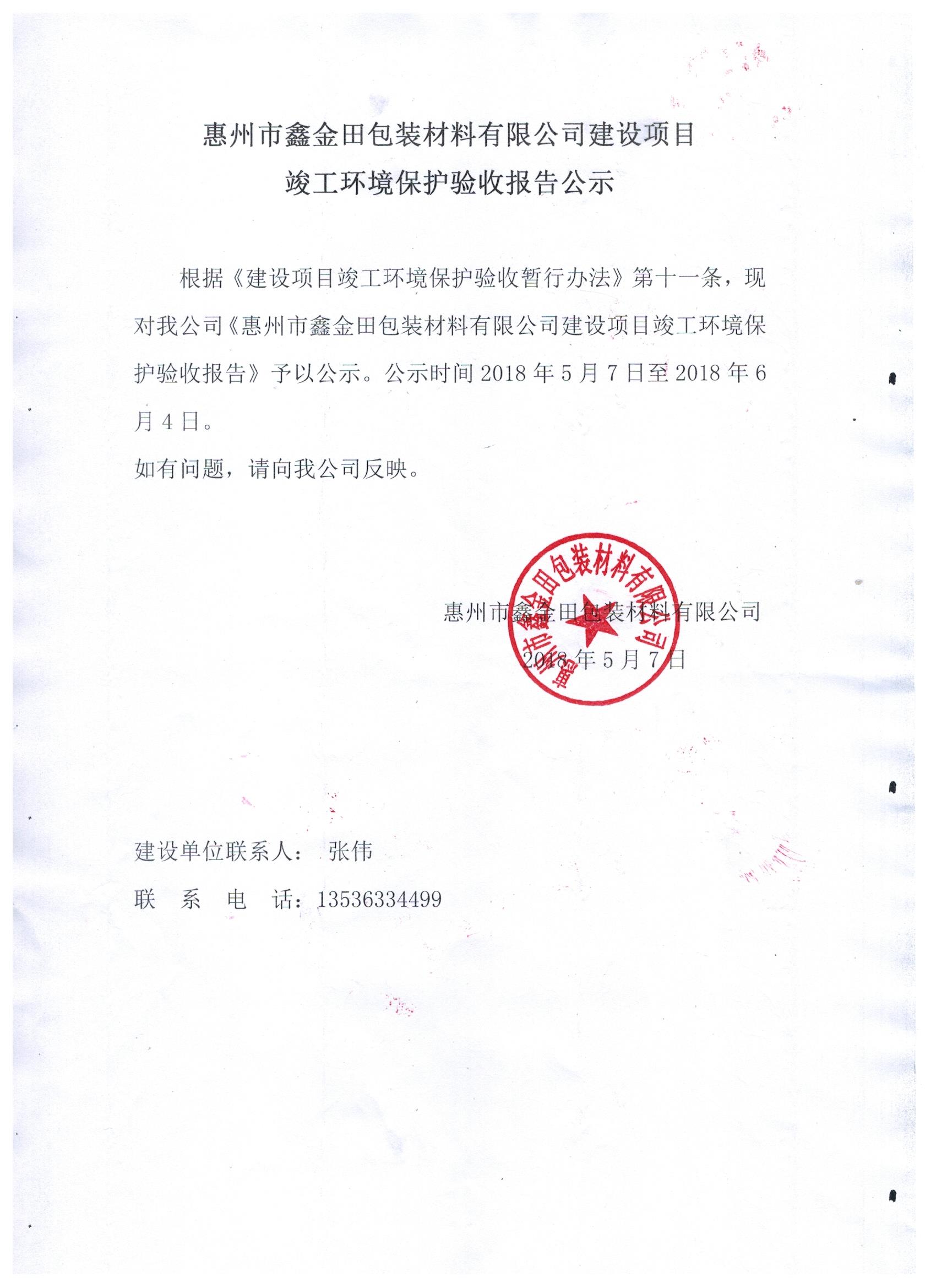 惠州市鑫金田包裝材料有限公司項目自主驗收監(jiān)測調(diào)查報告