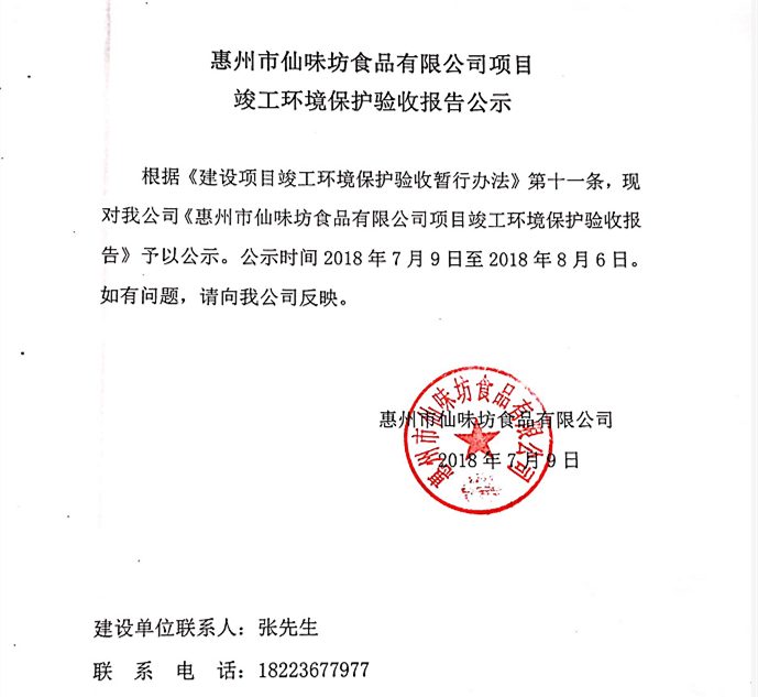 惠州市仙味坊食品有限公司項目竣工環(huán)境保護驗收報告公示