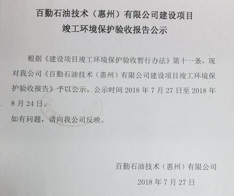 百勤石油技術(惠州)有限公司建設項目竣工環(huán)境保護驗收報告公示
