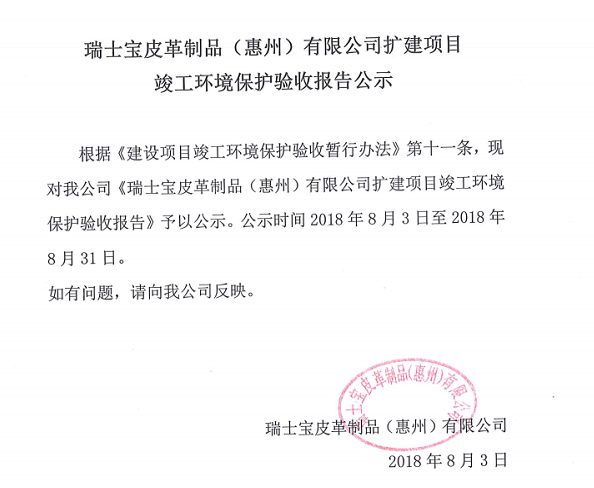 瑞士寶皮革制品(惠州)有限公司擴建項目竣工環(huán)境保護驗收報告公示